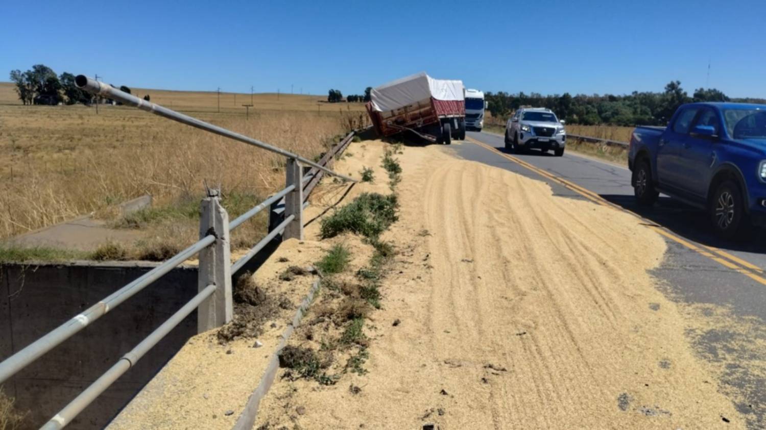 El impacto provocó que parte del cereal que el camión transportaba se esparciera sobre la calzada, lo que llevó a la interrupción del tránsito por aproximadamente dos horas mientras se realizaban las tareas de limpieza y recuperación del lugar.